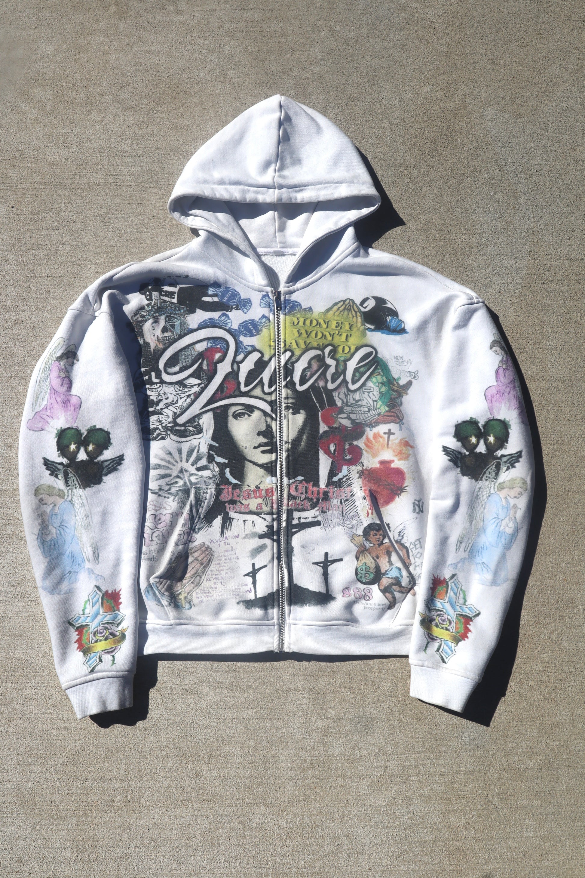Front Graphic Design: A striking portrait surrounded by intricate typography and vivid motifs such as angels, crosses, praying hands, and more.